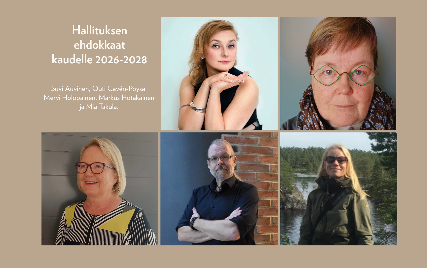 Ehdolle yhdistyksen hallituksen jäsenten vaaliin ovat ilmoittautuneet Suvi Auvinen, Outi Cavén-Pöysä, Mervi Holopainen, Markus Hotakainen ja Mia Takula.